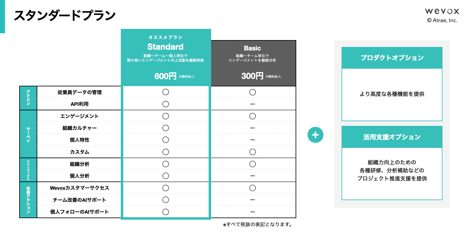 組織に関するデータは重要な指標であるものの、その集積が行き過ぎると、本来の目的を阻む可能性があります。そこで、「Wevox」は”組織に活かせるデータ形式”を探求し、今回のサーベイや分析機能の拡充、それに伴うプラン変更に至りました。