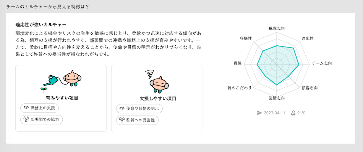 組織カルチャーサーベイとは、今の組織が持つカルチャーの特徴を8つの項目から見える化し、育みやすい項目と欠損しやすい項目を表示します。個々人のエンゲージメントスコアと組織全体のカルチャーの特徴を掛け合わせて分析することでより理想の組織・チームへと変革していくみなさまをサポートします。