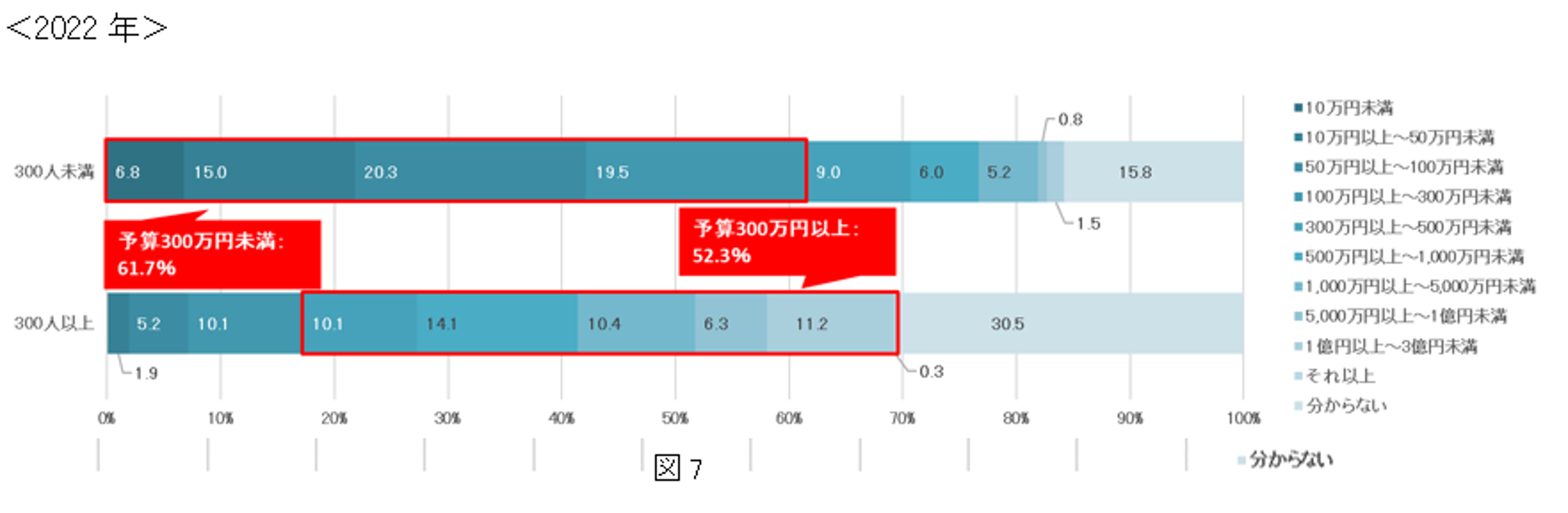 2022年の同調査で明らかになった会社規模による「AI格差」(図7)は、2023年にも引き続き見られました。300人未満規模の企業では、6割以上の企業が300万円までしかAI導入に予算を割けないのに対し、300人以上規模の企業では、約半数の企業が300万円以上予算を割くことができているという結果に(図8)。全体的にAIに対する年間予算は下がっているものの、「AI格差」の改善には至っていないことが分かりました。
