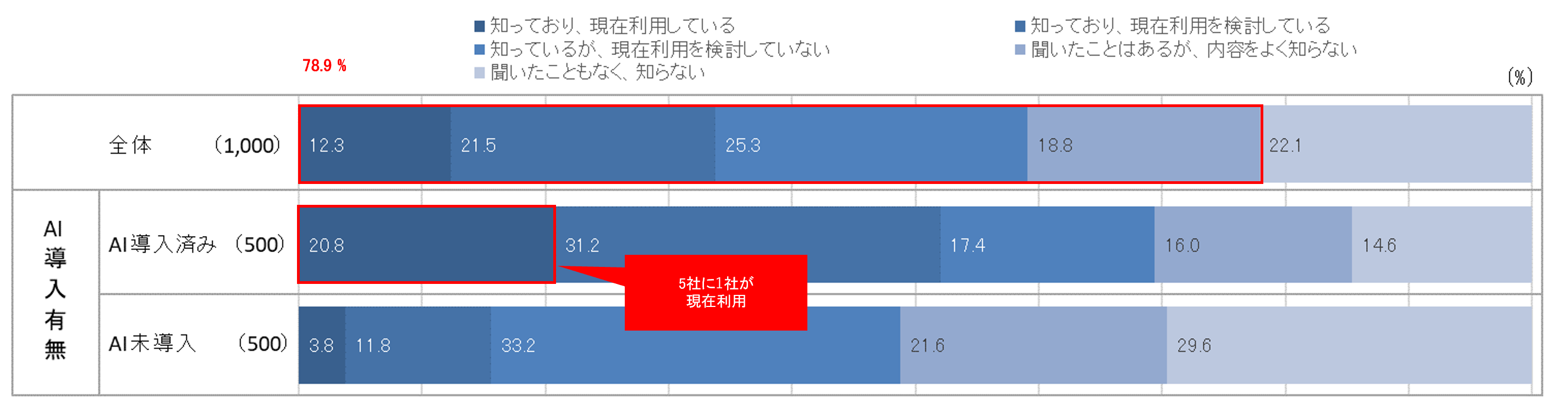 今話題となっている「Chat GPT」について20代以上のビジネスパーソンに聞いたところ、半数以上(59.1%)が知っていると回答。内容は知らないまでも聞いたことがあるという人も含めると、認知度は約8割(78.9%)にも上ります。また、AI導入済み企業の内5社に1社が「ChatGPT」を現在利用していると回答しており、今後もますます導入が進むと予想されます。(図1)