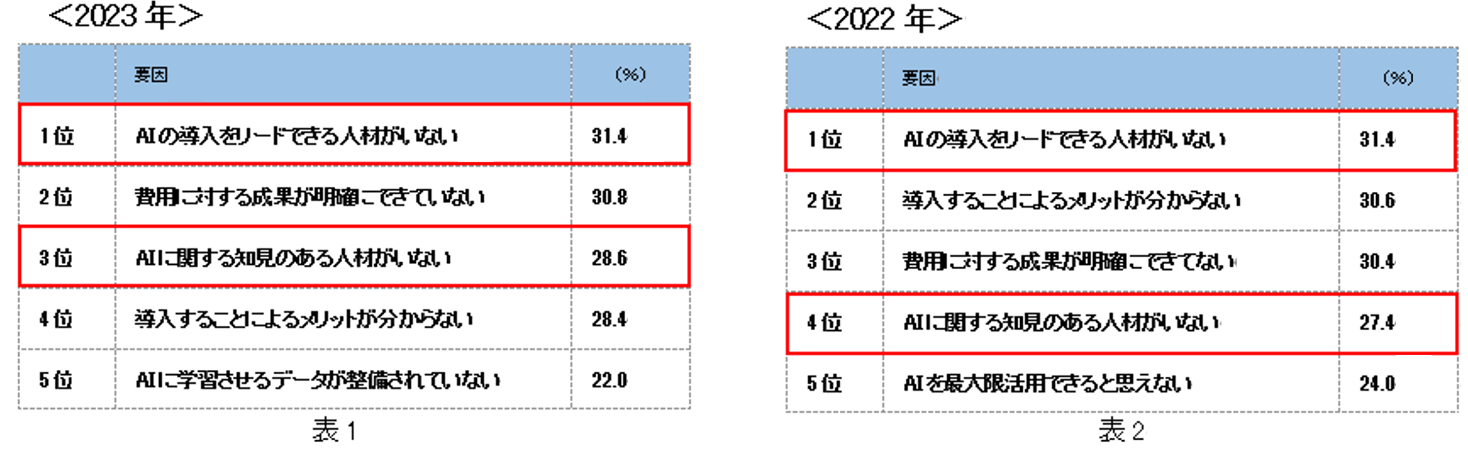 一方で、AI未導入の企業はAI導入に積極的ではなく、「現段階では検討していない」と回答している方が約6割(59.8%)に(図5)。AIが導入されていない主な要因としては、AIをリードできる人材がいない(31.5%)や知見のある人材がいない(28.6%)という点が挙げられ、2023年はAIが話題になっているものの、2022年から変わらず「人材不足」が課題であることがうかがえます(表1・表2)。