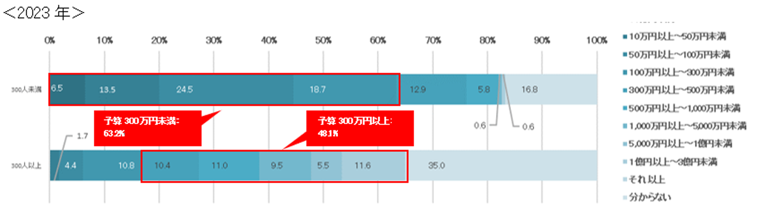 AI導入にかけている金額に、中小企業(300人未満規模)と大企業(300人以上規模)で格差あり。2022年と比較すると差は縮小したものの、引き続き「AI格差」が見られる。
