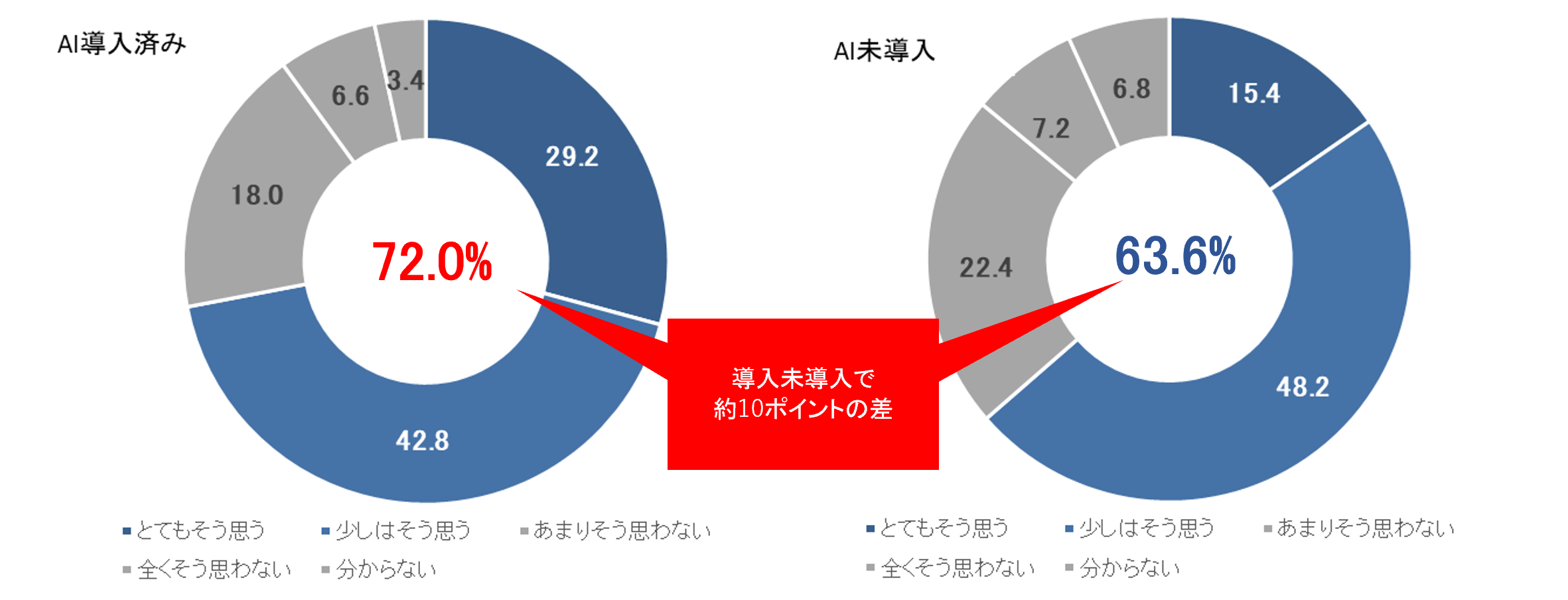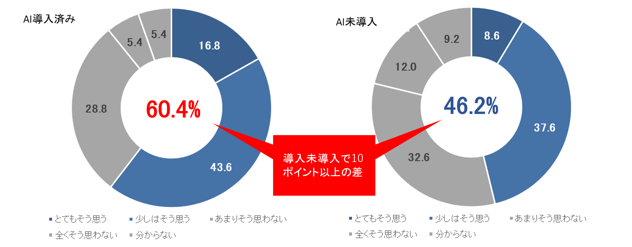 また、「AI導入により業務効率化するか(図3)」や「AI導入により未解決課題は解決するか(図4)」という質問に対し、AI導入済みの企業に勤める人とAI未導入企業に勤める人では、「そう思う」と回答する割合にいずれも10ポイント近く差がありました。実際にAIを活用することで、AI導入のメリットを実感できるようです。