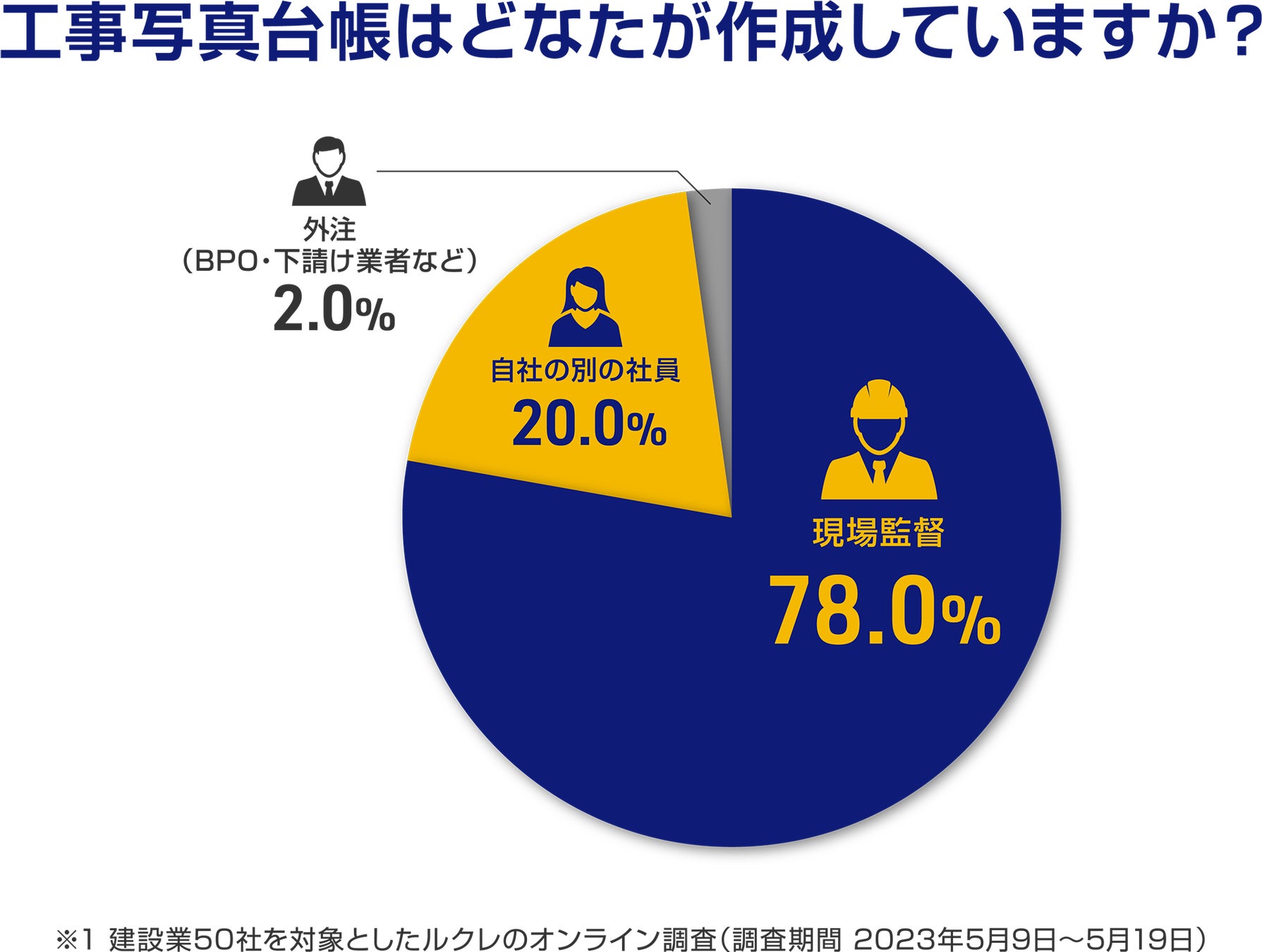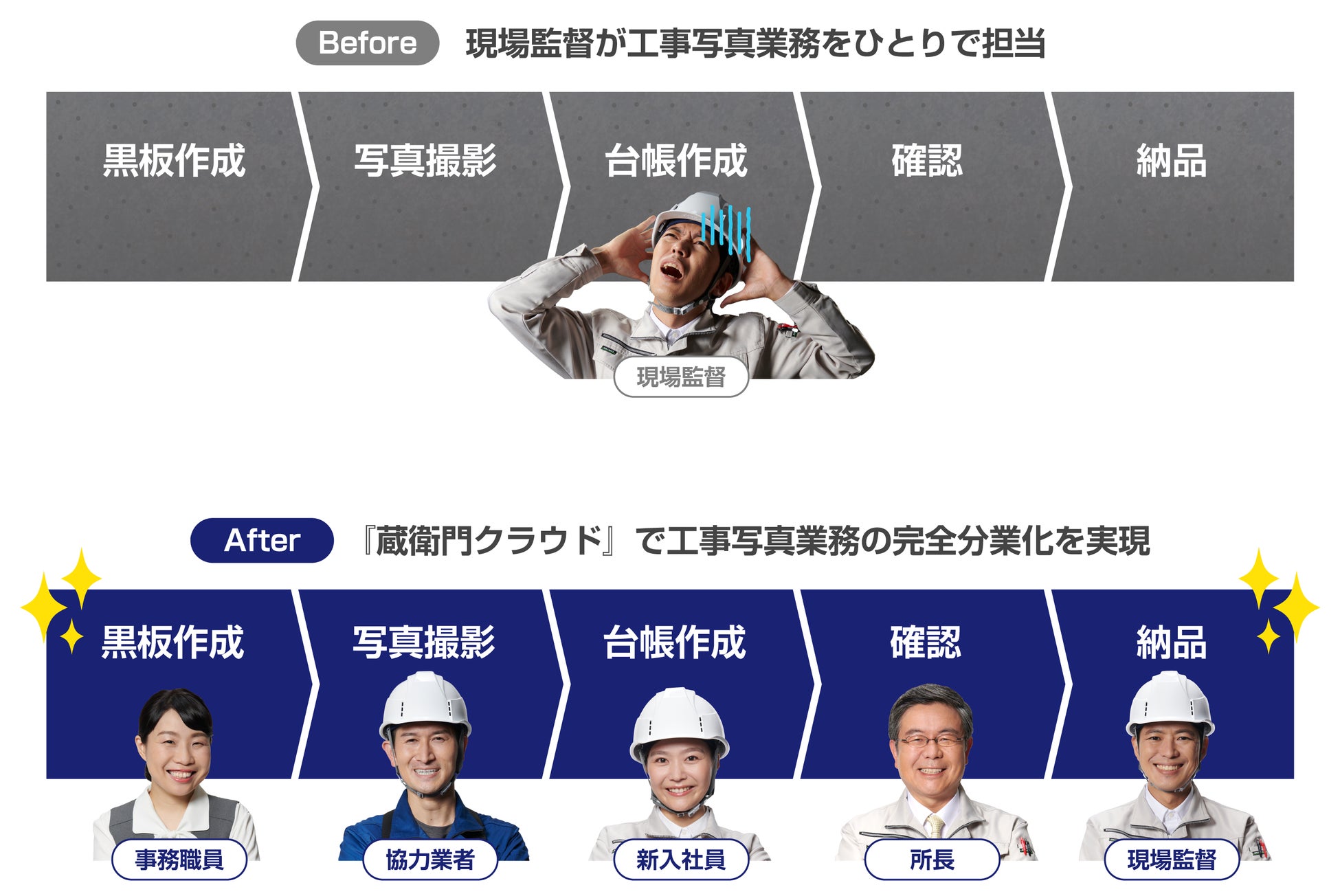 建設業は、2024年4月1日の「働き方改革関連法」適用までに、残業時間を削減することが喫緊の課題。しかしながら、現場監督がひとりで工事写真台帳を作成している割合が78%(※1)という調査結果がでました。現場監督へ業務が集中し、労働時間を削減できていない企業が多くあります。この状況を打破すべく、「クラウド写真台帳」機能により『蔵衛門』は分業化を加速させ、建設業界の働き方改革を推進します。