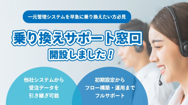 通販事業者様からの「一元管理システムの急停止に伴い、早急に一元管理システムの乗り換えをしたい」旨のお問い合わせが急増していることから、「乗り換えサポート窓口」を開設いたしました。「乗り換えサポート窓口」では、主に下記の内容でサポートを行ってまいります。