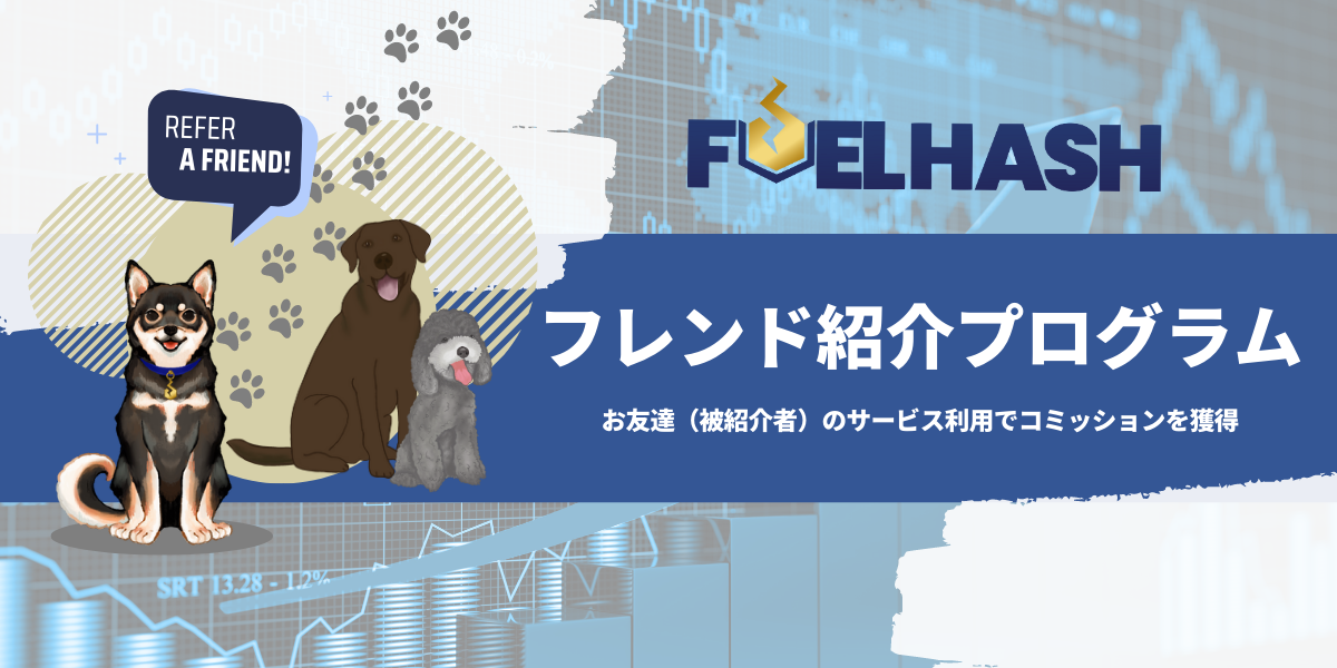 FUELMININGのアカウントをお持ちの方(紹介者)がお友達を紹介され、紹介されたお友達(被紹介者)が新規にFUELMININGのアカウントを作成の上、サービス(ハッシュレンタル、クリプトレンディング、クリプトレンド)をご利用された場合に、紹介者がコミッションを獲得できるプログラムです。FUELMINING第4回販売(ハッシュレンタル)も対象となります。