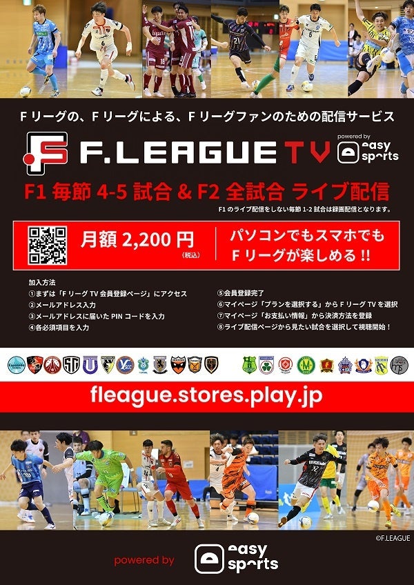 一般社団法人日本フットサルトップリーグ(理事長:藤口光紀、東京都文京区)は、EASY PRODUCTION株式会社(代表取締役:趙 守顕、東京都港区)とFリーグ2023-2024 ディビジョン1およびディビジョン2の配信を『FリーグTV powered by easysports(以下、FリーグTV)』にて行うことが決定しましたので、お知らせ致します。