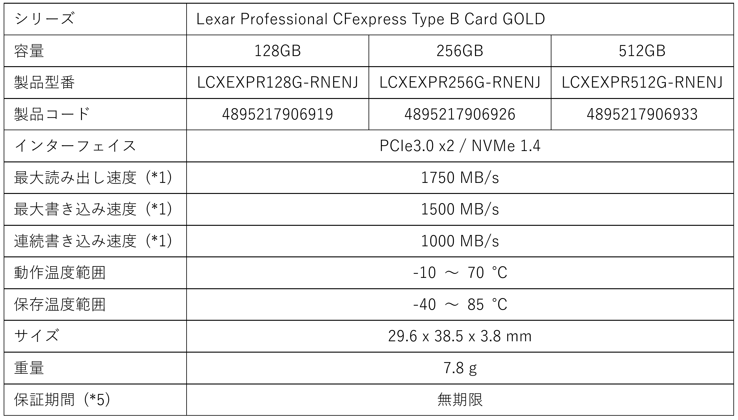 *5 保証条件はLexarの保証ポリシーに準じます。詳しくは、Lexar公式ホームページをご参照下さい。
