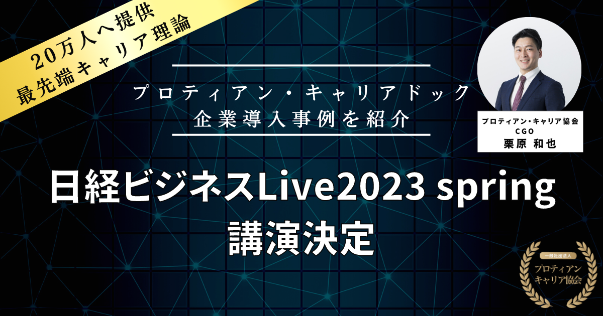 当協会登壇情報 DAY3 テーマ 「人財」:自律的人財が活躍できる仕組みづくり ソリューション講演:プロティアン組織開発導入事例 -個人のキャリア自律を促す最前線- 《日時》2023年 5月 31日(水)15:10-15:40 《登壇者》プロティアン・キャリア協会 CGO(最高事業成長責任者) 栗原 和也 《概要》厚生労働省が推進するセルフ・キャリアドックに、現代版プロティアン・キャリア理論を組み込んだ、従業員のキャリア自律を推進する体系的な支援サービス「プロティアン・キャリアドック」の導入事例を通して、どのように個人のキャリア自律を促進するか、変化のプロセスを紹介致します。 |