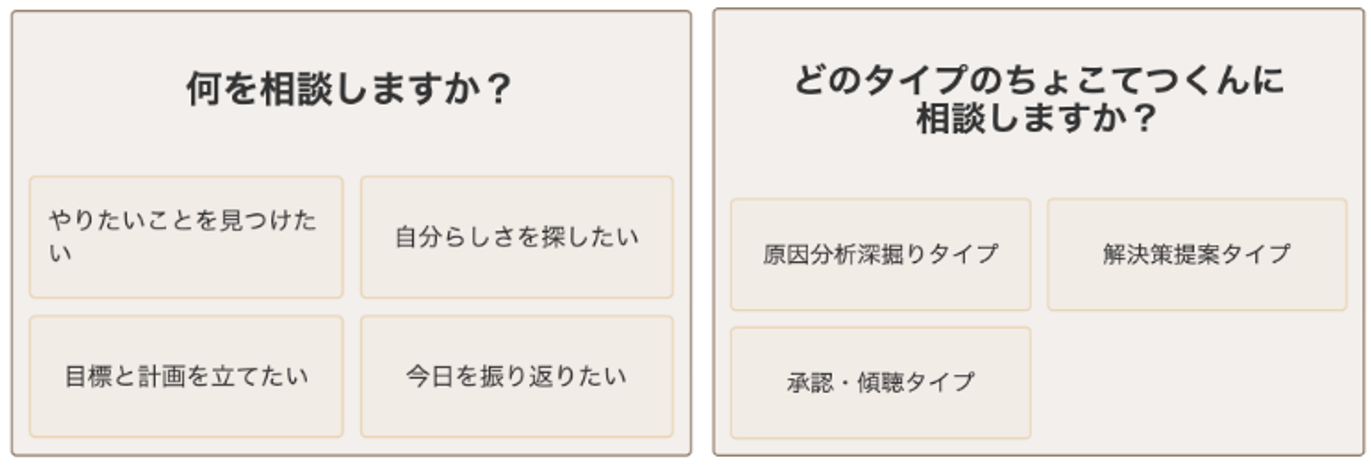 AIキャリア支援コーチ『ちょこてつ』は、働く人のキャリアに関する悩みを少しずつ解決するサービスです。「やりたいことがない」「自分にはスキル(能力)がない」「価値観と言われても困る」「考えただけで行動に移せない」といったお悩みを、AIキャリア支援コーチ『ちょこてつ』との対話を通じて解決に導きます。