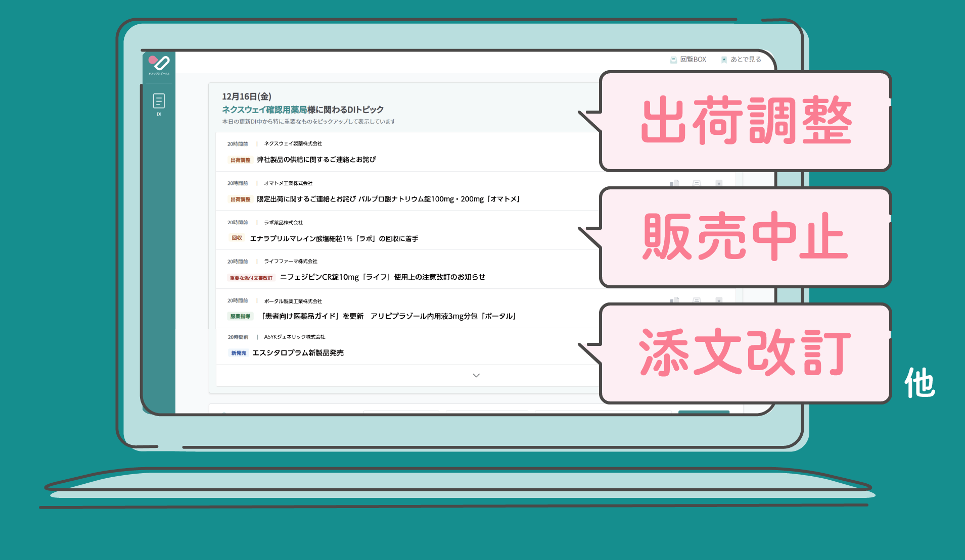 DI トピックが掲載されることで、「GooCo」のユーザーである薬剤師は薬歴を使用しながら、効率よく DI をキャッチアップし、コア業務である服薬指導・対人業務を更に充実させることができます。