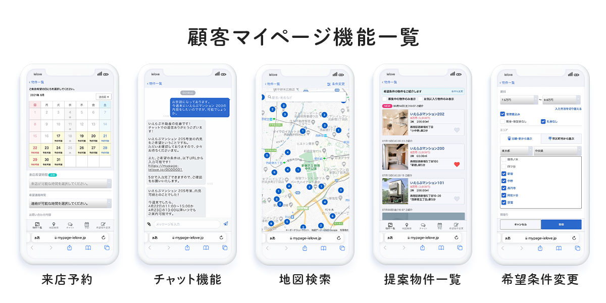 顧客マイページとは、各顧客に自動生成される専用ページです。来店予約機能やチャット機能により顧客の来店を促進できます。さらに物件の地図検索や過去に提案された物件の確認、希望条件の変更など顧客にとって便利な機能も揃っています。不動産仲介会社は、顧客がマイページを見ているタイミングや閲覧物件を確認できるため、追客をしやすくなります。なお、賃貸仲介だけでなく売買仲介にも対応しています。