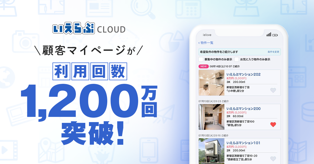 2018年のサービス開始以来、幅広い機能と使いやすさが評価され、このたび顧客マイページの累計利用回数が1,200万回を突破しました。1日の利用回数はサービス開始時の2倍となる1万回を超えています。いえらぶGROUPでは引き続き「いえらぶCLOUD」をはじめとしたサービスを通じて、不動産流通のDXを進め、不動産業界全体を活性化してまいります。