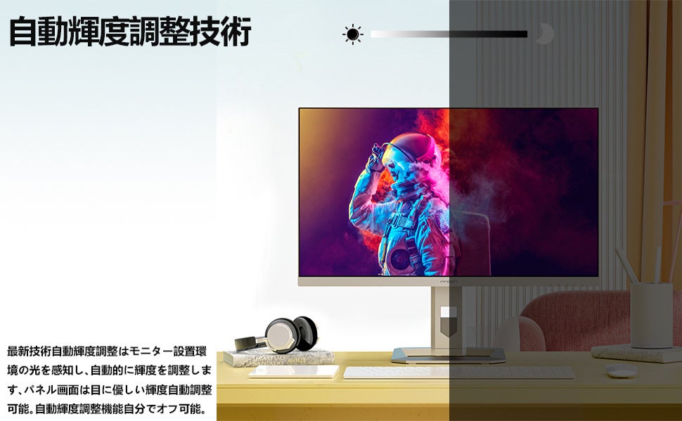 自動輝度調整機能も搭載しており、モニターが設置されている場所の明るさにい応じて自動で明るさを調整。部屋を暗くした際には自動で画面を暗くすることで眼への負担を抑える事が可能。本機能はオフにすることもできるため、正確な色表現が必要な際にはオフで利用できます。