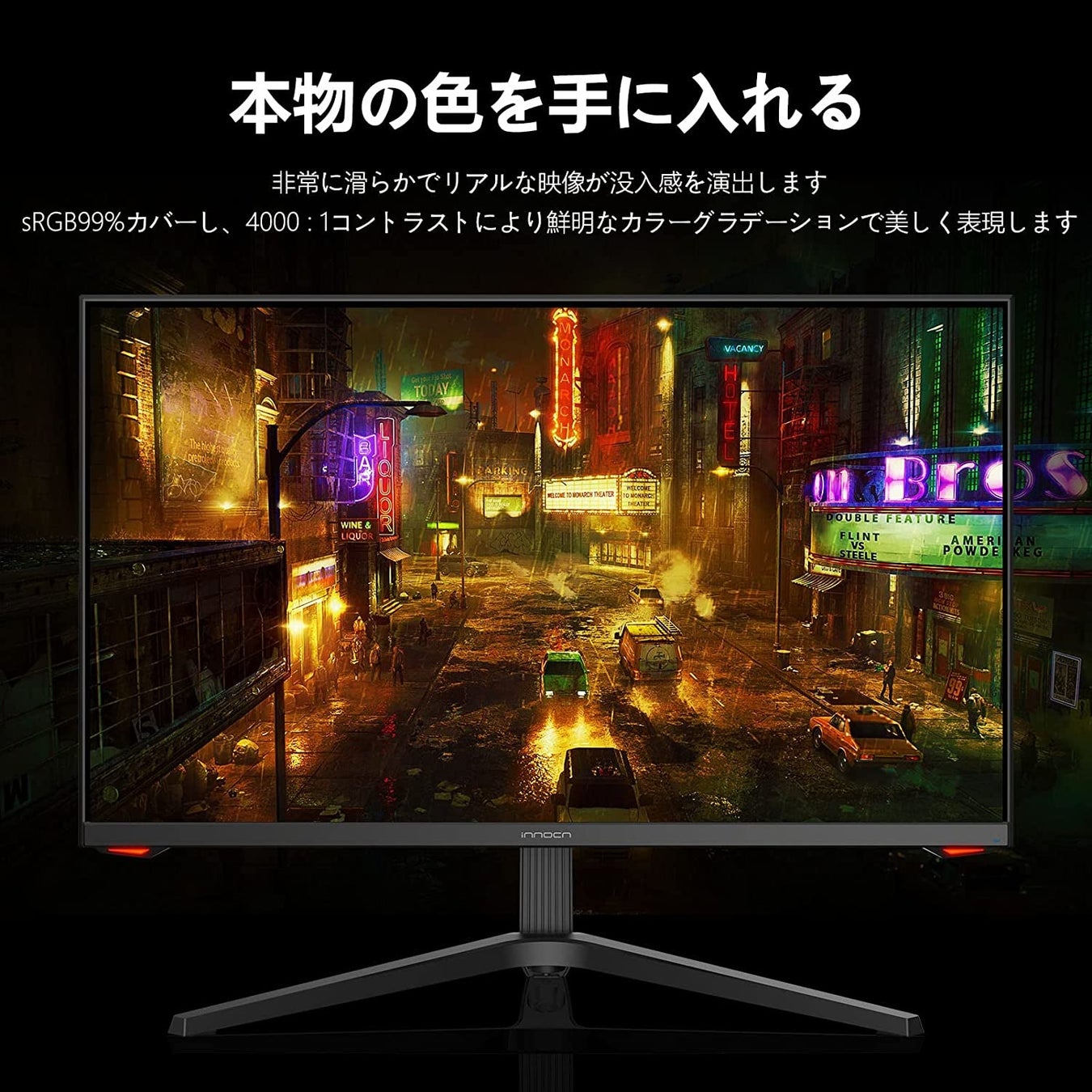 Innocn 27G1Rは2560×1440の2K解像度と144Hzの高リフレッシュレート、そしてsRGBカバー率99%の高い色表現を実現したVAパネル採用のミドルクラスのゲーミングモニターです。NVIDIAのG-SYNCとAMD FreeSyncテクノロジーへの対応と、144Hzのリフレッシュレート、1msの応答速度に加えて4000:1の高コントラスト比によってゲーミングモニターに求められる高い映像表現を確保。また、HDMI端子×3とDisplayPort×1と豊富な入力端子を用意し、PCだけでなくゲーム機やTVチューナー、ストリーミングデバイスなどを接続しマルチメディアを楽しむのにも最適な製品です。