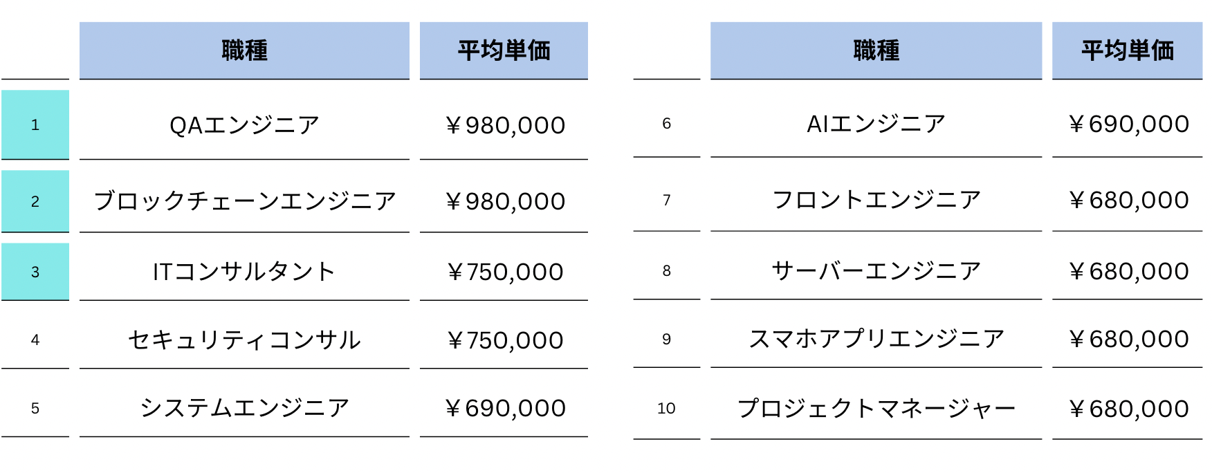 ■フリーランスエンジニアの職種別受注単価|平均単価トップはQAエンジニア、ブロックチェーンエンジニア