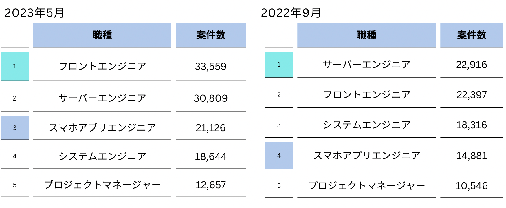 また上位3職種では、2022年9月時点では、3位のシステムエンジニアと3,500件以上の差をあけて4位であったスマホアプリエンジニアが、2023年5月時点ではシステムエンジニアと2,500件以上の差をあけて3位にランクインしました。