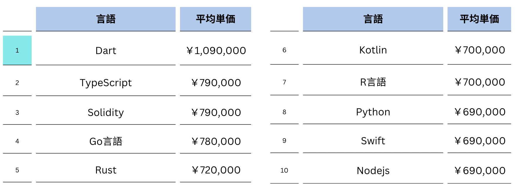 ■フリーランスエンジニアの言語別受注単価|平均単価トップはDart