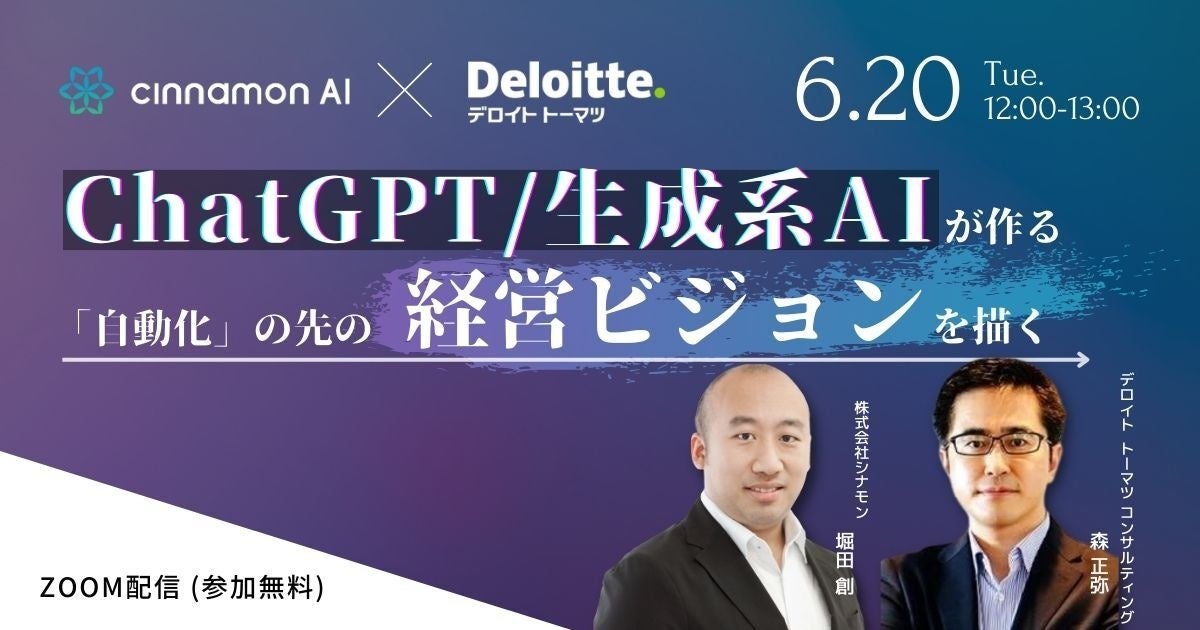 当日は、シナモンAI共同代表の堀田創と、デロイト トーマツ コンサルティングの森 正弥氏による対談形式で実施します。
