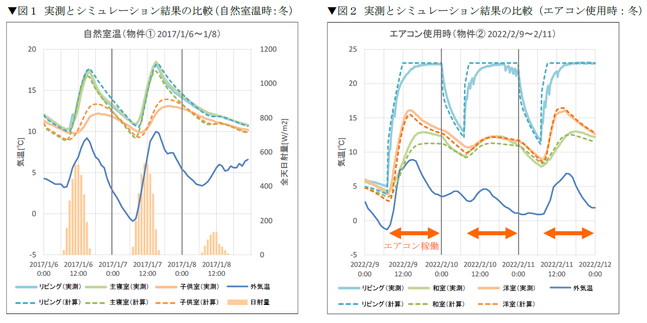 インテグラルではEnergyPlusを搭載するにあたり、EnergyPlusを用いたホームズ君のシミュレーション結果について実物件での室温実測結果との比較、分析を行いました。それに基づき、熱容量や換気性能等のパラメータを調整することで、実情に近いシミュレーション結果が得られることを確認いたしました(図1 図2)。