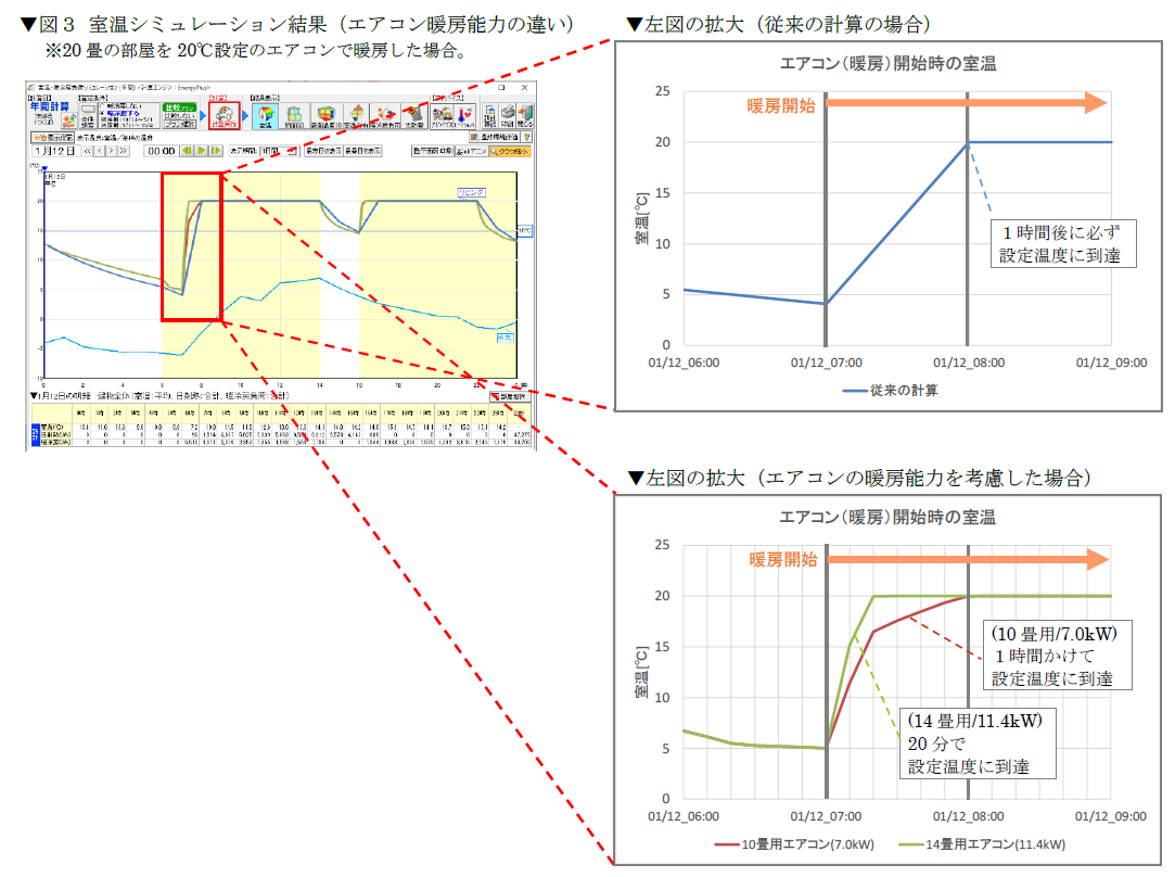 また、EnergyPlusの搭載と合わせて、従来のホームズ君では計算できなかったエアコンの暖冷房能力に応じた室温変化を計算する機能に対応しました(図3)。従来のホームズ君の室温計算では、部屋の広さや断熱性能の違いおよびエアコンの性能によらず、エアコンを稼働する指定を行うとその次の計算ステップ(標準では1時間間隔)に必ず設定温度に到達するものとして計算していました。新バージョンでEnergyPlusを使用した計算では、エアコンの暖冷房能力の上限を考慮しながら、10分間隔の室温の変化を計算します。これにより、エアコンによって設定温度に到達するのにどの程度の時間がかかるか、またエアコンの能力不足により設定温度に到達しないことはないかを確認できるなど、より現実に即した高度な室温計算、熱負荷計算が可能となります。
