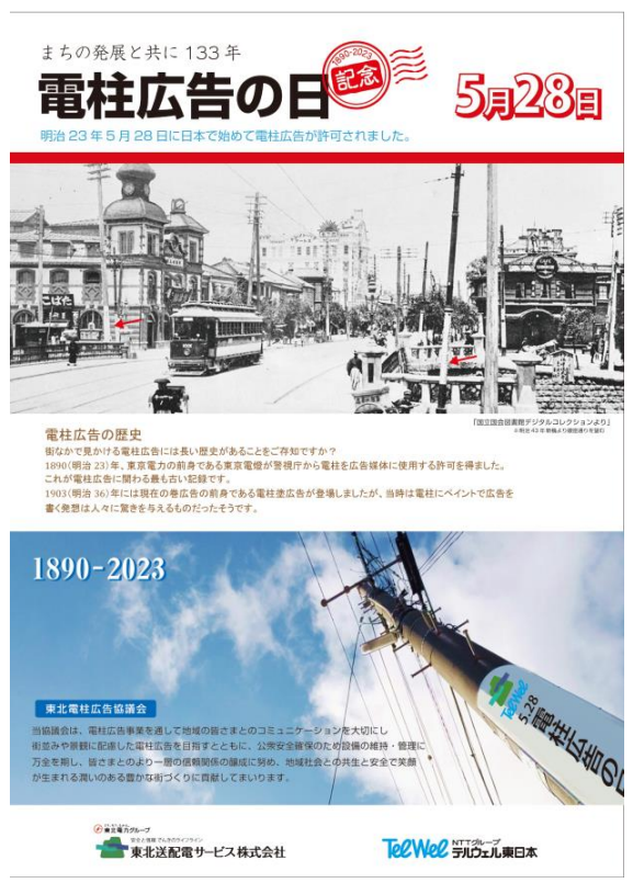 明治23年5月28日、当時の警視庁から、東京「麹 町区飯田町2丁目( 九段坂下より俎橋間 )」と「麹町区麹町通」の電柱に国内で初めて広告掲出許可が出されたことから、このたび5月28日が「電柱広告の日」の記念日として公に認定登録されました。これを機にNTT電柱の電柱広告を販売する当社において、利便性の高さや社会貢献に資するサービスの一環であることを広く周知すべく、YouTube動画配信を開始することとなりました。