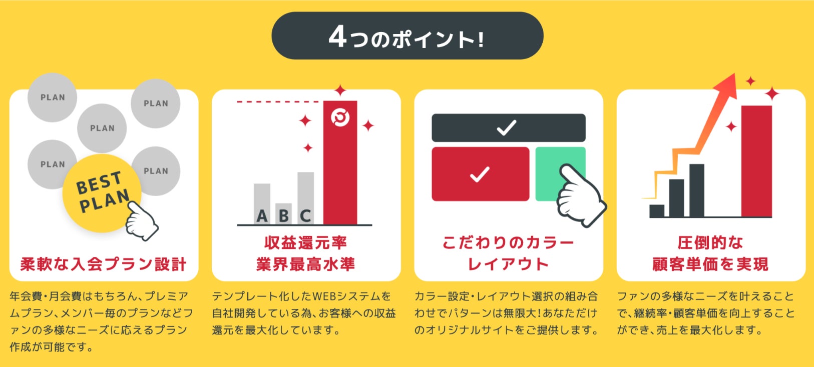 日本テレビグループ企業の日テレWandsが、20年にわたり培ったWebサービス運営のノウハウを活かし提供する。システムの構築や個人情報の管理といった手間を気にせず、「ファンとつながる場」を素早く、リスクを最小限にして実現。コストや時間を抑え、気軽にファンコミュニティを立ち上げることができる。
