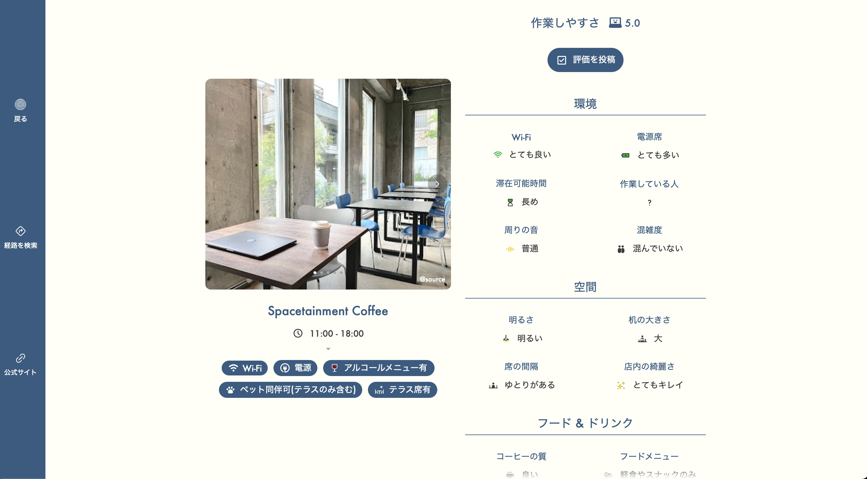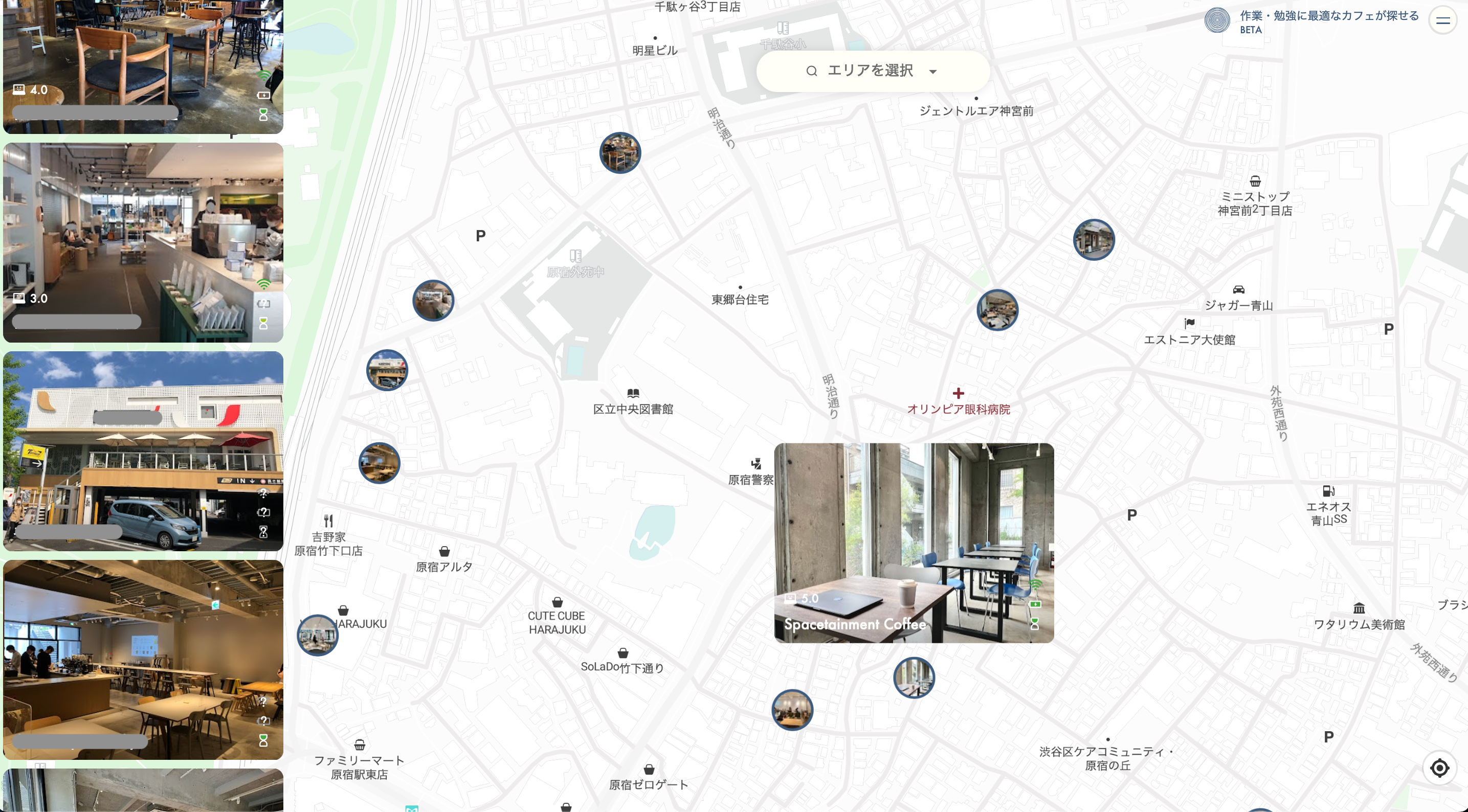 ピンをクリックしなくとも、各スポットがどのような場所なのか分かると良いというご要望を多く頂いたため、マップの各ピン上にスポットのトップ写真を表示できるようにし、よりスムーズに興味のある作業カフェを発見できるように致しました。