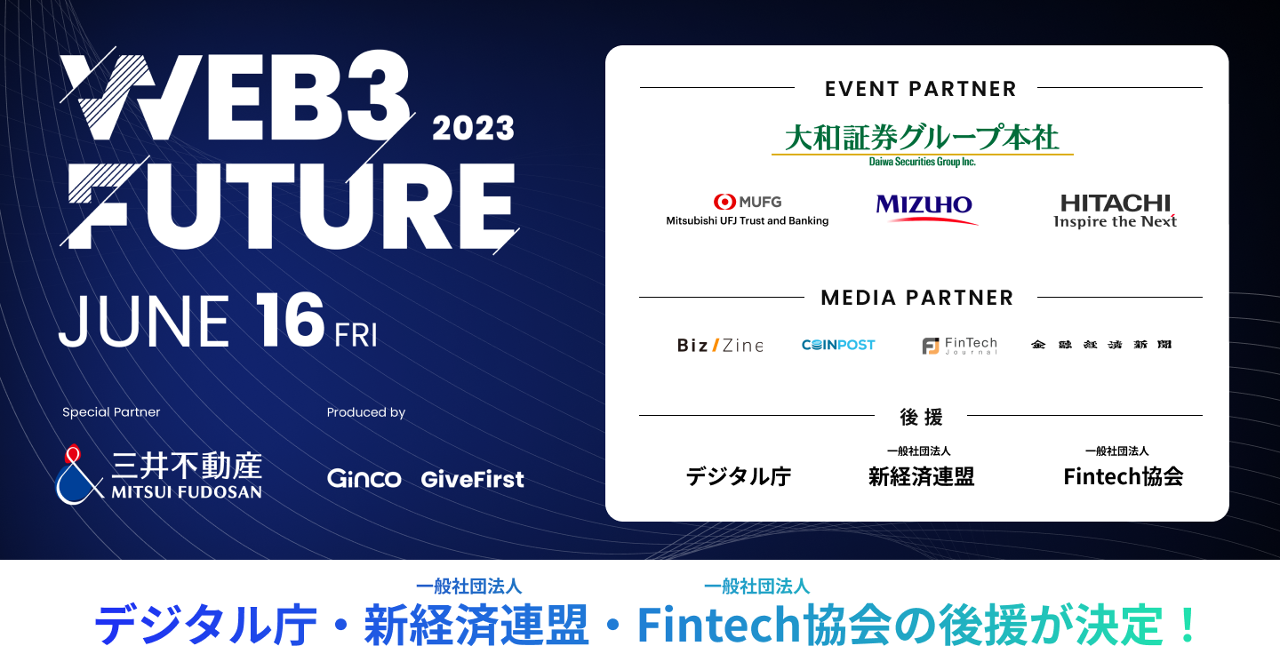 この度、政官財の幅広い分野からの議論を目指すWeb3 Futureの趣旨に賛同頂き、デジタル庁、一般社団法人 新経済連盟、一般社団法人 Fintech協会が決定しました。