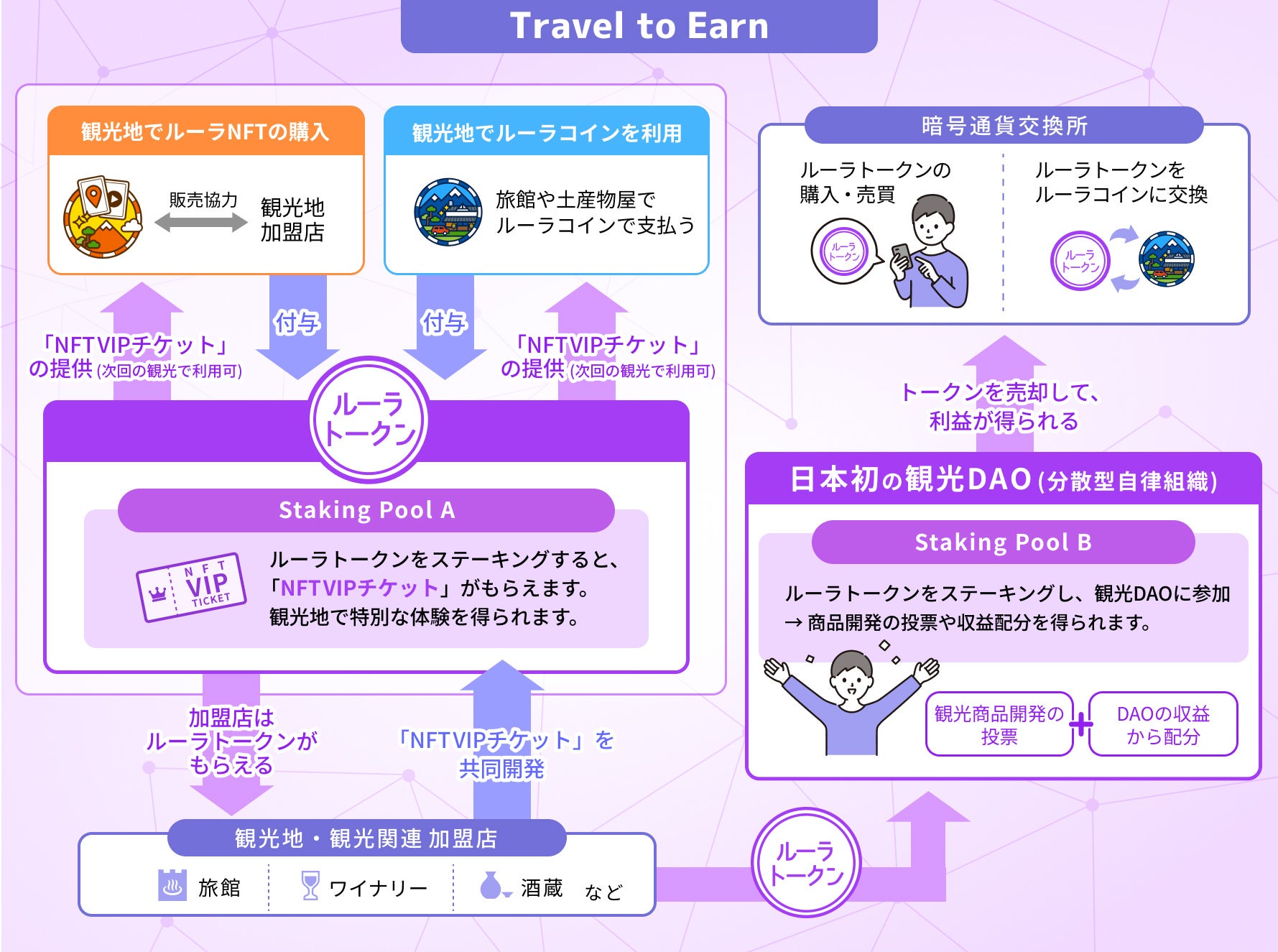 ルーラトークンとは、日本のポストコロナにおける観光業界、インバウンド旅行者の復興を目指し、国内観光を促進する「Travel to Earn」をコンセプトにした世界初の暗号資産になります。トークンを所有することで、全国の観光地で使える「VIPチケット」が付与され、そのチケットを使って、観光地で特別な体験ができたり、限定の宿泊プランやツアーに参加できたりと、観光地支援に繋がる様々な体験を得ることができます。