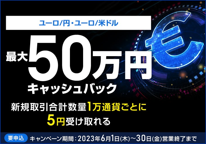 セントラル短資FX株式会社(本社:東京都中央区、代表取締役社長:松田 邦夫)は、2023年6月1日から30日まで、ユーロ/円とユーロ/米ドルの新規取引を対象としたキャッシュバックキャンペーンを実施します。