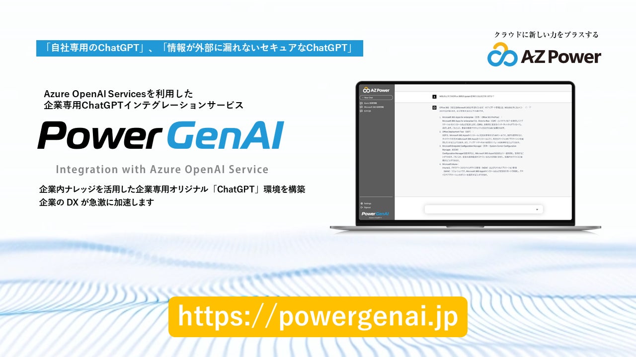 AZPower株式会社(本社:東京都千代田区/代表取締役社長 橋口 信平、以下AZPower)は、2023年5月29日、「自社専用のChatGPT」、「情報が外部に漏れないセキュアなChatGPT」をコンセプトにした Azure OpenAI Service を利用したChatGPTインテグレーションサービス「PowerGenAI」の提供を開始します。