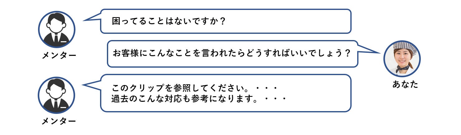 従業員個人にカスタマイズされたAIチャット形式のメンターが、店長業務において最も負荷が高いとされるアルバイト教育やモチベーション管理を代行します。従業員のプロファイルを事前にインプットしておくことで、個別最適なアドバイスをすることが可能です。アルバイトだけでなく店長向けのメンターも実装します。