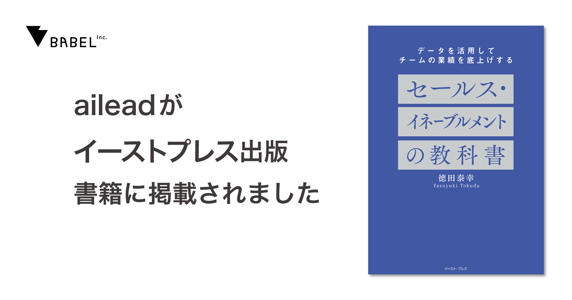 バベルが提供する商談解析クラウド「ailead(エーアイリード)」は、属人的な暗黙知を誰でも再現できるスキルに変換するというテーマにおいて、既存の業務フローを変えることなく商談音声・映像データを蓄積を行い、SFAの自動入力による作業の効率化・営業チームのマネジメントや育成の効率化・分析領域でも活用できるツールとしてご掲載いただきました。書籍内、第3部CAPTER2「セールス・イネーブルメントの実践手段」に、aileadの概要が掲載されます。