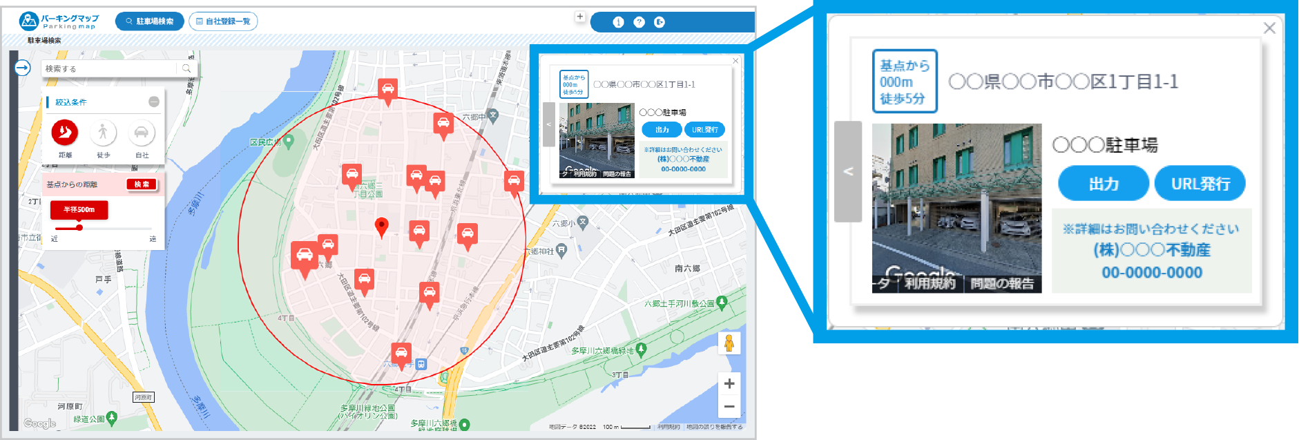物件周辺の「月極駐車場」情報(※3)をWeb上で簡単に掲載・検索できるサービスです。不動産管理会社は「手数料の有無」や「募集中」などの条件に限らず、不動産客付会社に向けて情報を無料で掲載することができます。不動産仲介会社は入居希望者に物件を案内する際に、物件周辺の「月極駐車場」情報をスムーズに検索できるので物件選定の後押しとなります。