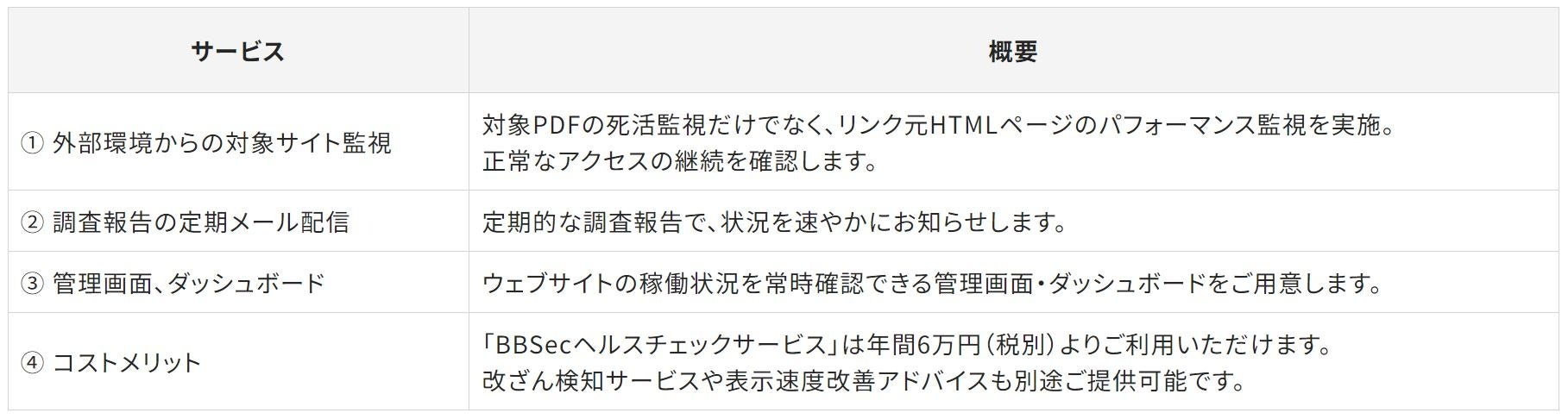 このような背景をもとに、BBSecでは外部環境からの電子提供措置が正しく行われているかを常時監視するとともに、その担保となる記録や、中断した際の対策までを「BBSecヘルスチェックサービス」にてご提供します。