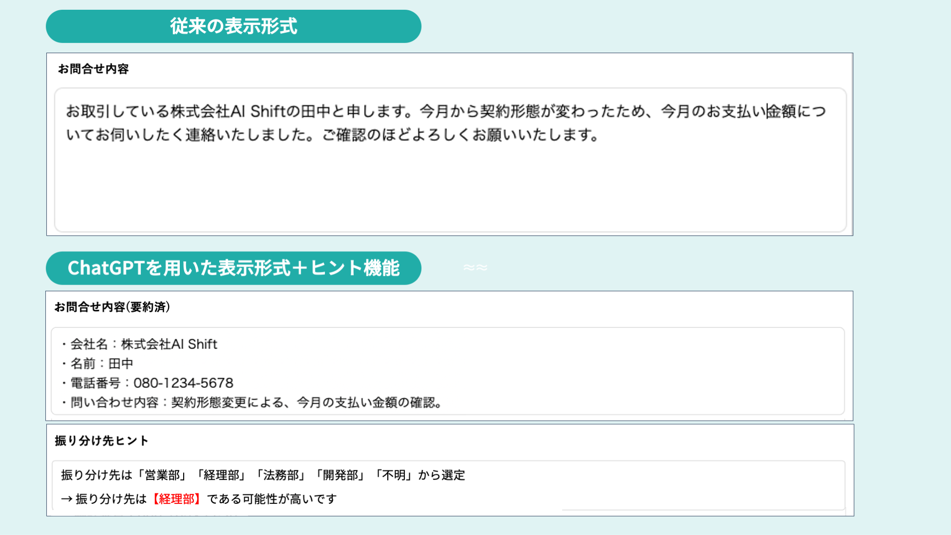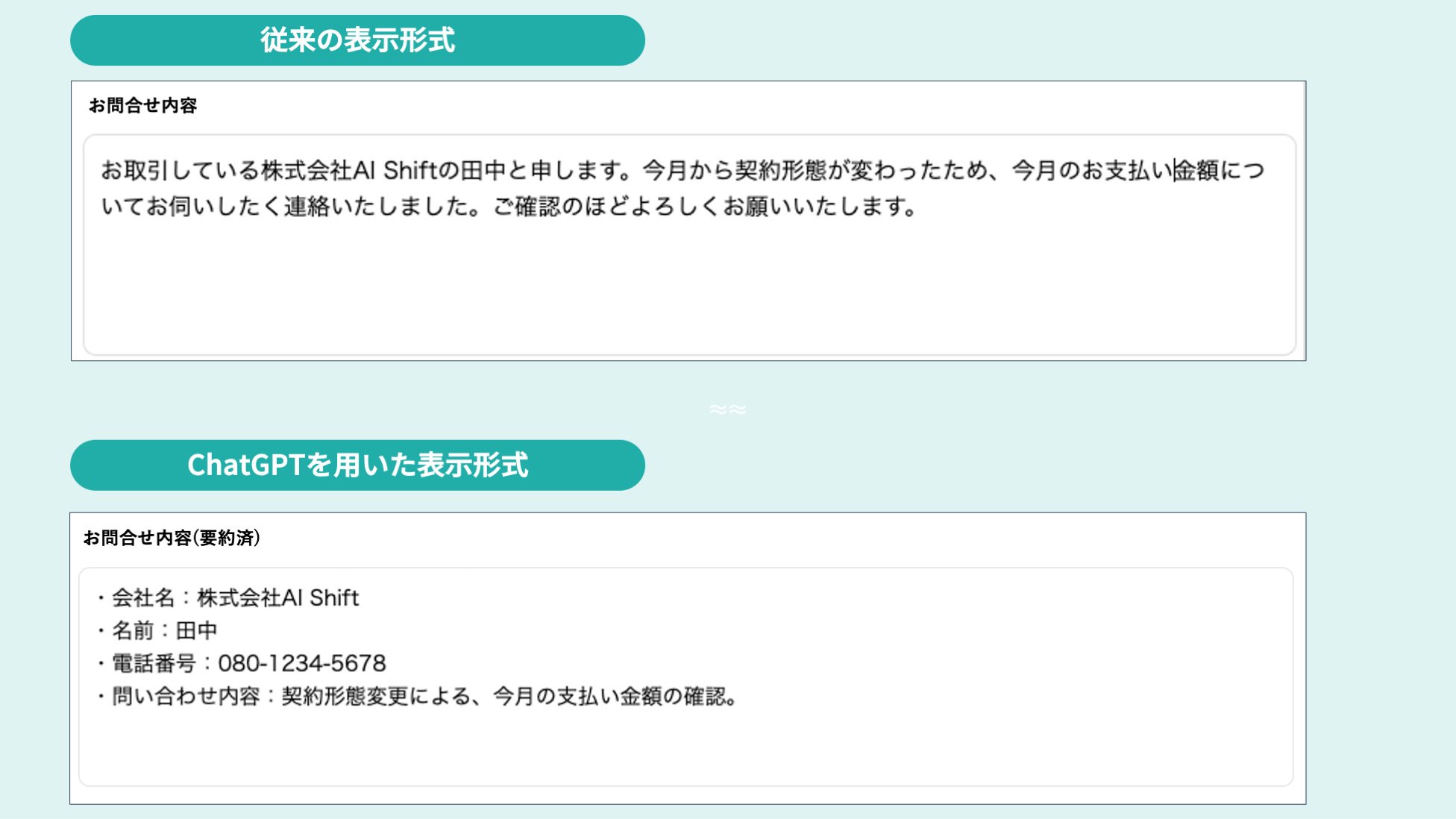 利用者とボイスボットの電話内容を要約し、フォーマット化いたします。この時、問い合わせ内容のみでなく、事前にヒアリングしてある電話番号など別項目も要約時に出力可能です。次にイメージ例を示します。