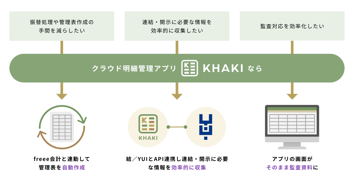 そこで、「明細管理」に特化したKHAKIにより、単体の明細管理、連結PKGの作成、開示の注記情報の作成、そしてそれぞれのプロセスにおける監査(対応)の隙間を埋めて、全体のプロセスをよりスムーズに進められるようにすべく、本サービスの提供に至りました。