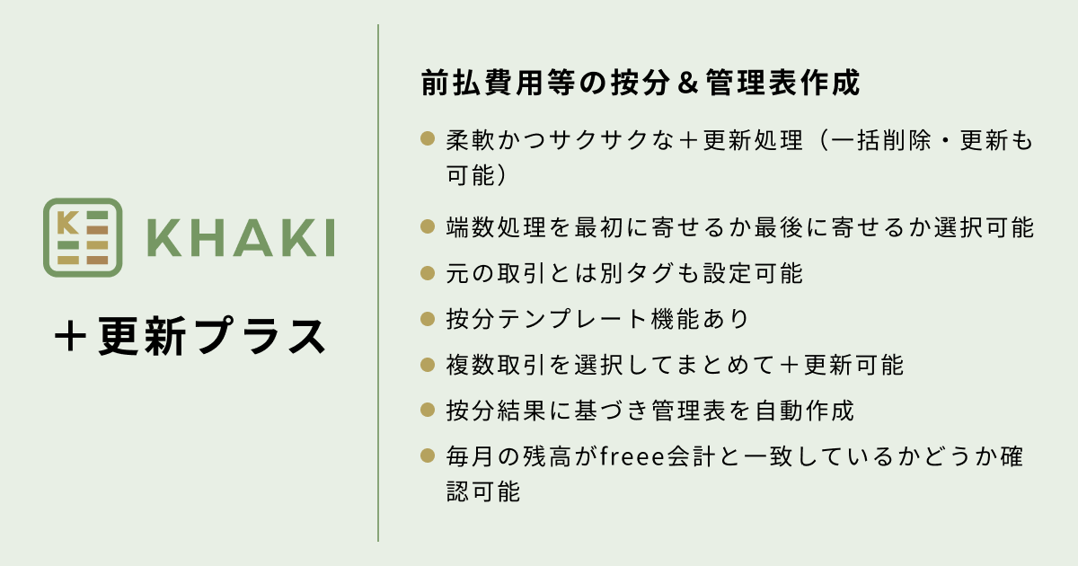 今回ローンチするシリーズは、「前払費用等の按分」及び「管理表の作成」を自動化する「KHAKI +更新プラス」です。freee会計の「+更新」機能を利用し、按分処理の効率化と同時に明細表の自動作成が可能になります。