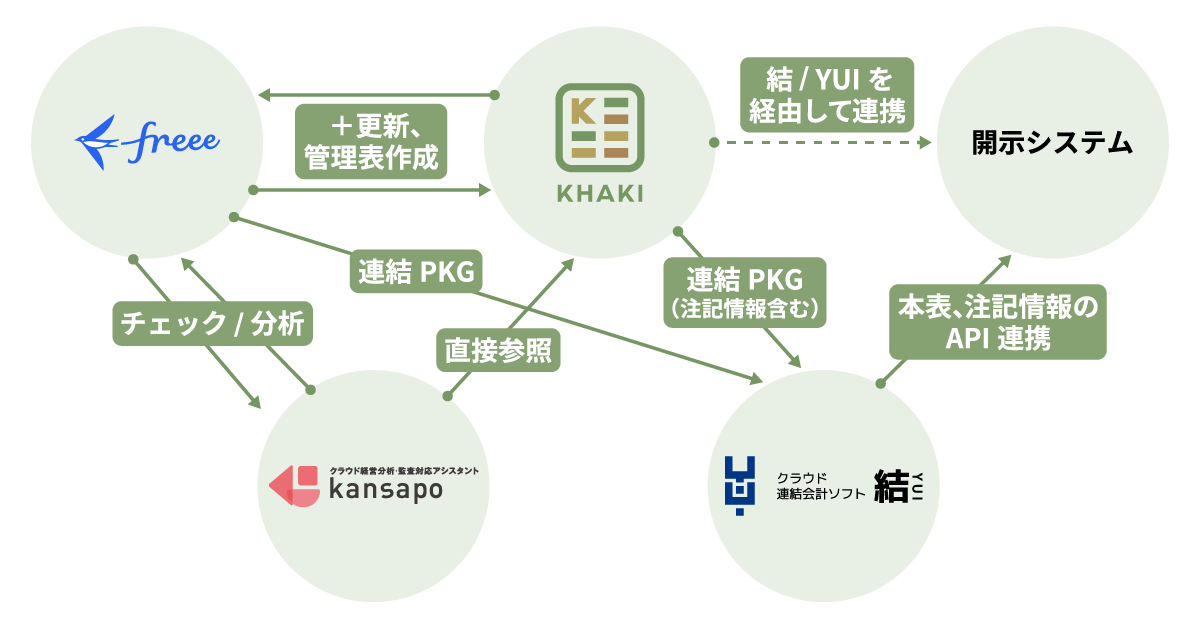 すでに、単体=freee会計、連結=結/YUI、開⽰=開⽰システム、監査(対応)=kansapo、といったツールが存在しており、それぞれのプロセスがデジタル化され、API連携されていますが、各プロセス間の⼀部の連携(特に明細情報の連携)については、未だに⼿動による管理・転記作業が⾏われています。