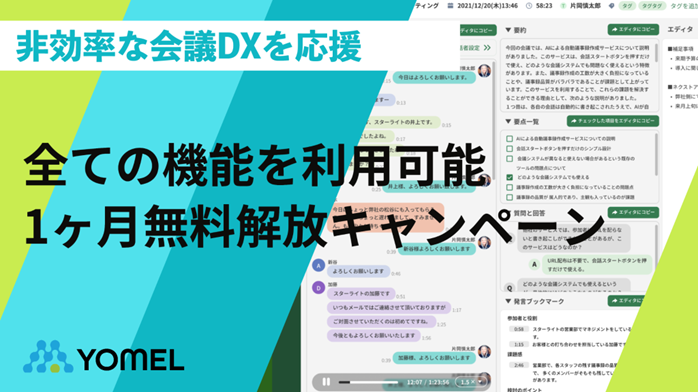 当社では、この画期的な体験により企業の会議DXを応援するべく、期間限定でYOMELの無料解放キャンペーンを実施いたします。ご提供機能は、全文自動書き起こし、話者の自動識別、要約、論点の抽出、質疑応答の抽出、トピックの抽出、議事録編集機能等になります。ご興味のある企業担当の方は下記よりお申込みください。