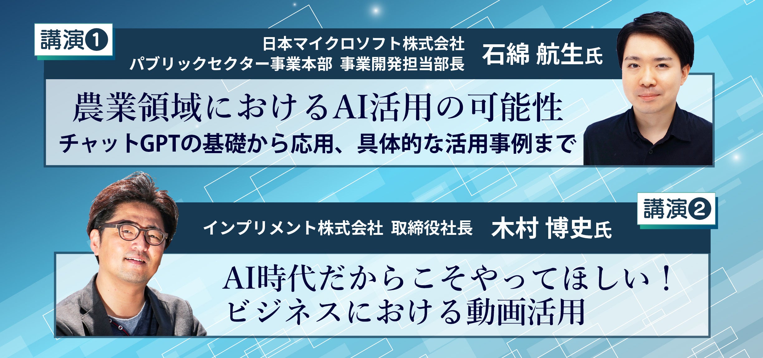 今回は、今話題の生成系AI(チャットGPT)を題材に、「AIって何だ?」という基礎的な部分から、具体的な活用事例に至るまで、わかりやすく説明し、農業領域でAIを活用するとどんなことができるのか、何が変わるのかをご紹介します。講演2: AI時代だからこそやってほしい!ビジネスにおける動画活用