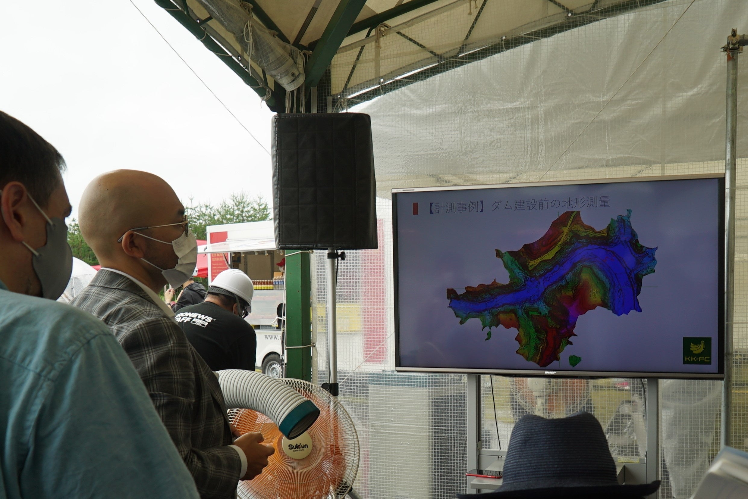 大野翔太郎さんが登壇。昨今、急速に増えているドローン測量のデモンストレーションを実施しました。レーザー測量は、1秒間に75万発のレーザーを照射し、木が生い茂っている森などでも地形を正確に捉える特徴があり、従来のヘリコプターの飛行は高高度、高速であるのに対しドローンでは低高度、低速の飛行が可能となり、高密度なデータが収集し、短時間で正確な測量を行えることを説明しました。