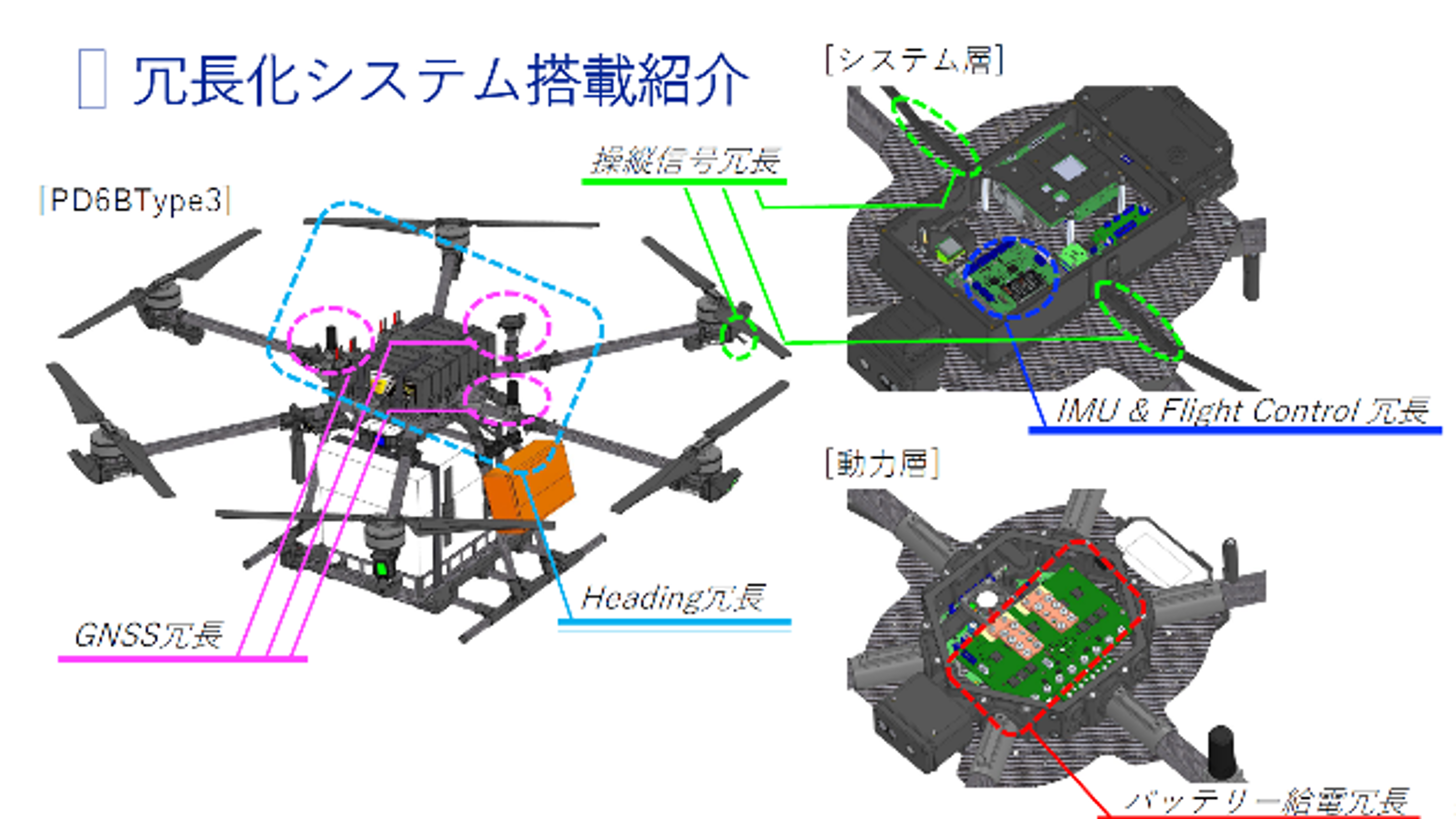 高精度ドローンには、複数のマイクロコンピュータユニットが搭載されており、普段は別々のタスクをこなしています。メインのマイクロコンピュータユニットが異常を起こした際、他の機能モジュールの異常を察知しモジュールの代わりを担う振る舞いをすることで、フェイルセーフが実現し冗長性をもたせています。現在、開発中ですが、年内から実装していくと発表しました。