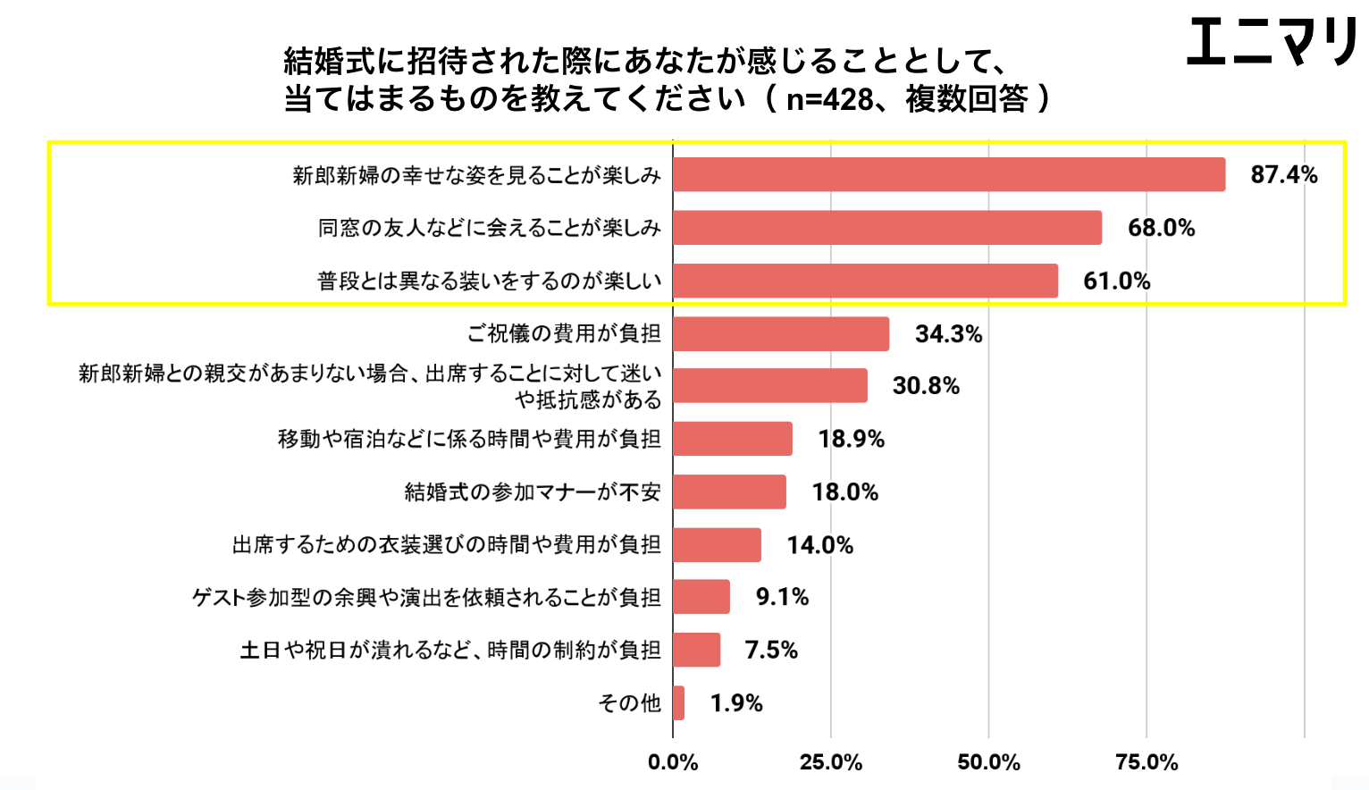 結婚式に招待された際に感じることを聞いたところ、第1位が「新郎新婦の幸せな姿を見ることが楽しみ」87.4% 、第2位が「同窓の友人などに会えることが楽しみ」68.0%、第3位が「普段とは異なる装いをするのが楽しい」61.0%となりました。新郎新婦ふたりの晴れ姿を祝福したいという気持ちを大前提に置きつつ、久しぶりに同窓と再会することや、結婚式という特別な場にふさわしい衣装を着ることなど、非日常的な体験を楽しみにしている様子がうかがえました。