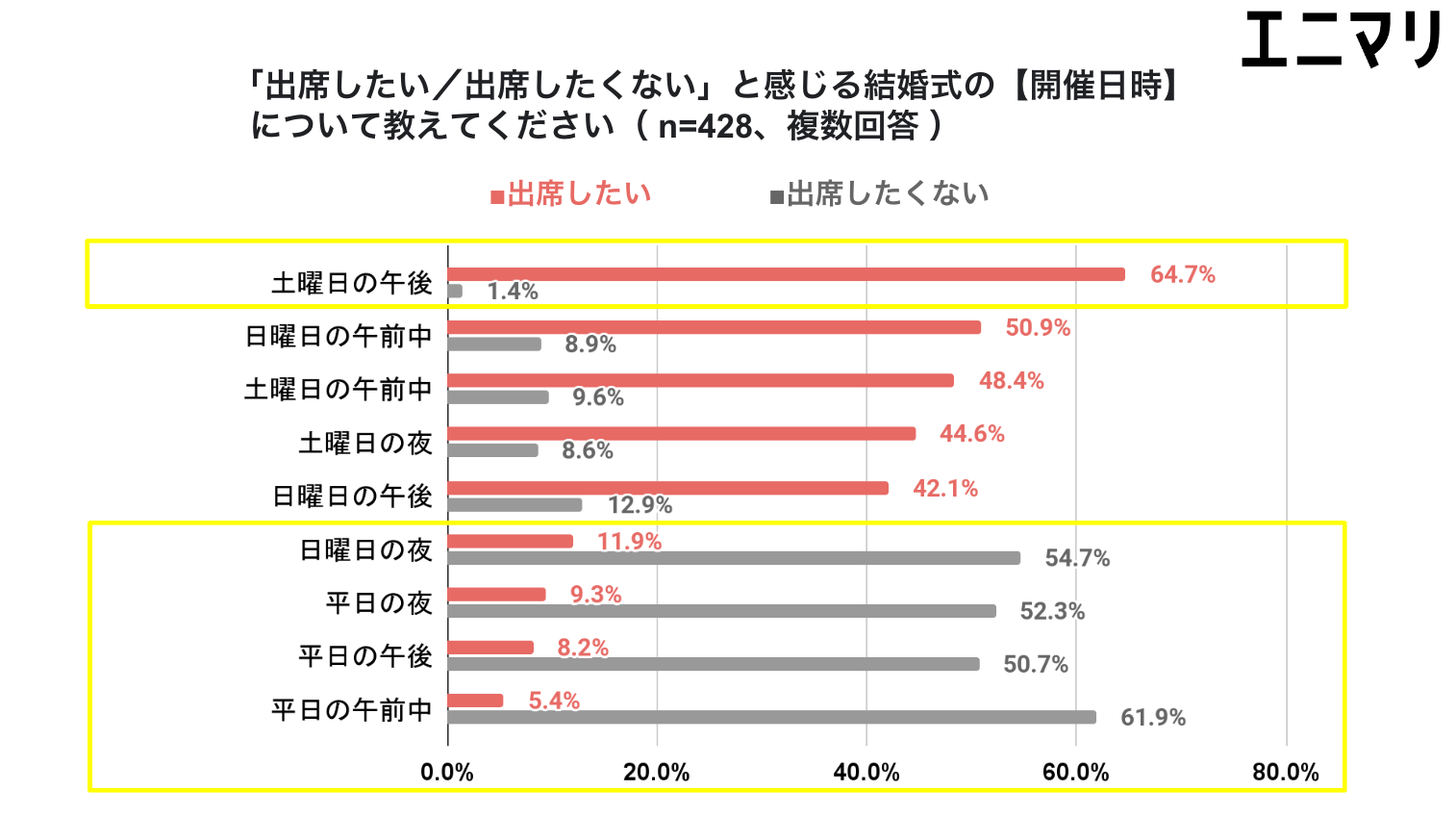 出席したい開催日時は、「土曜日の午後」が64.7%で最も好まれることがわかりました。一般的に多くのゲストが土曜日は休みであり、午後の結婚式であれば身支度などの時間に余裕もあると考えられます。次いで、「日曜日の午前中」50.9%、「土曜日の午前中」48.4%などが続きました。