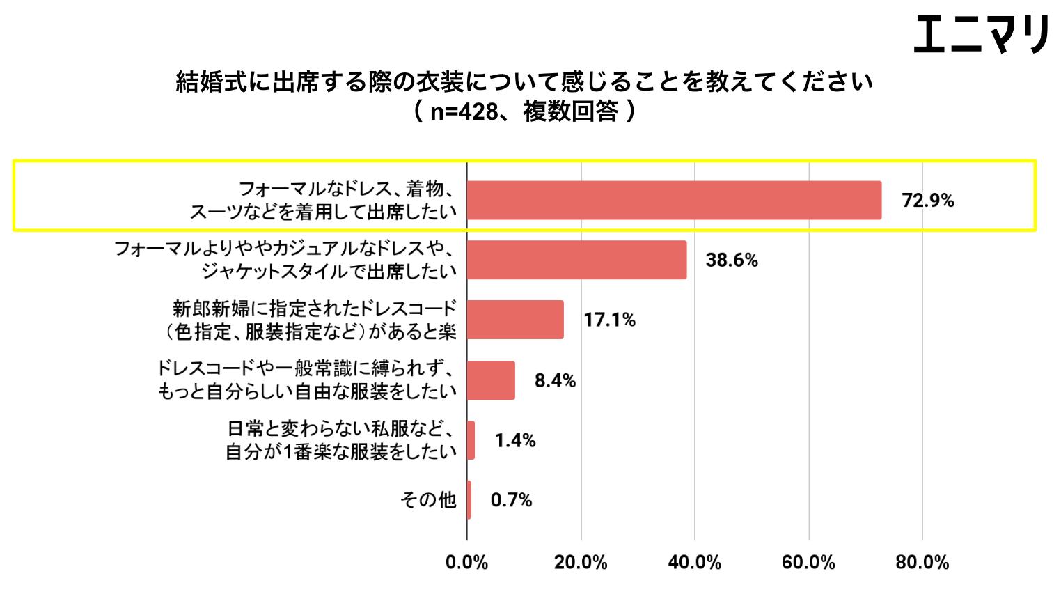 また、結婚式に出席する際の衣装について聞いたところ、「フォーマルなドレス、着物、スーツなどを着用して出席したい」が7割以上で圧倒的に多いことからも、普段とは異なる、格式のある装いを好んで着用している方が多いことがわかりました。