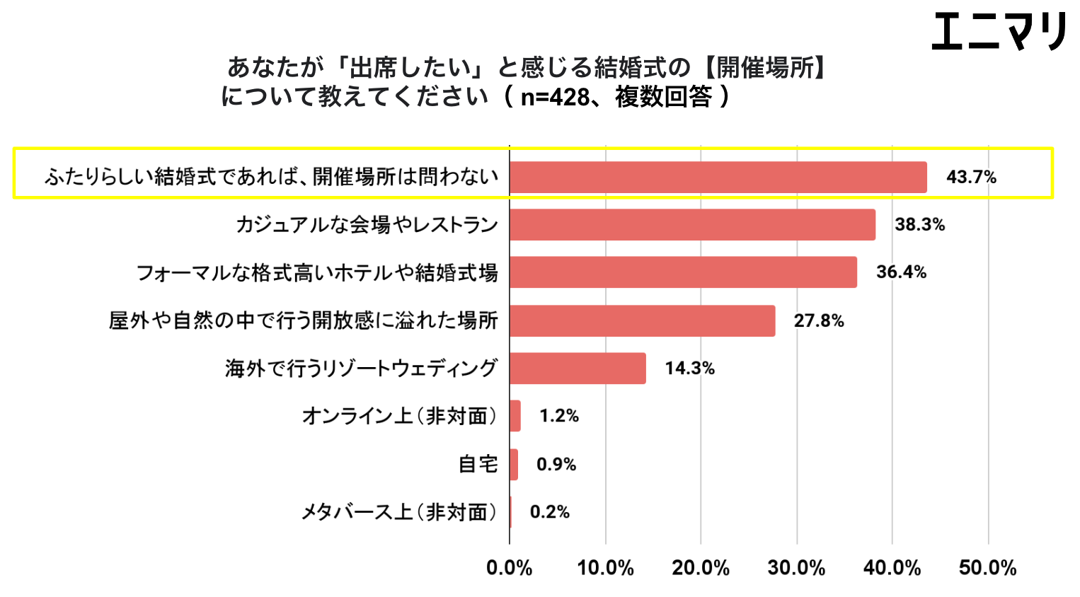 出席したい開催場所:4割以上が「ふたりらしい結婚式であれば、開催場所は問わない」