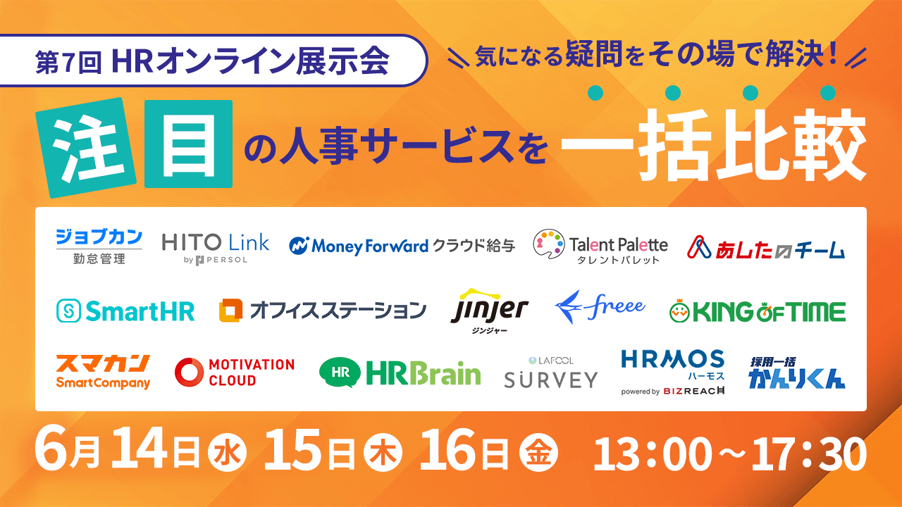 今回のHRオンライン展示会では、「勤怠管理」「給与計算」「労務管理」「タレントマネジメント」「組織改善ソリューション」「採用管理」の6カテゴリーで、自社の業務効率化の実現や課題を解決するための手がかりを知れる機会を提供していきます。