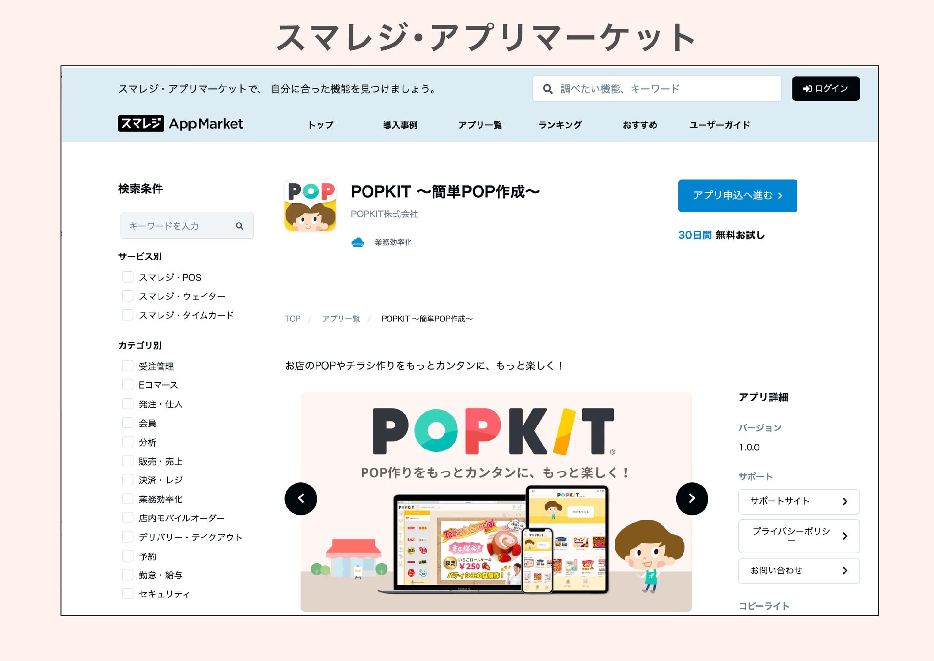 この度、POPKITが「スマレジ・アプリマーケット」に参加しました。 スマレジ利用ユーザーは、スマレジ・アプリマーケットでPOPKITアプリの申込を行うことで、ログイン連携ができるようになり、POPKITを利用することができます。